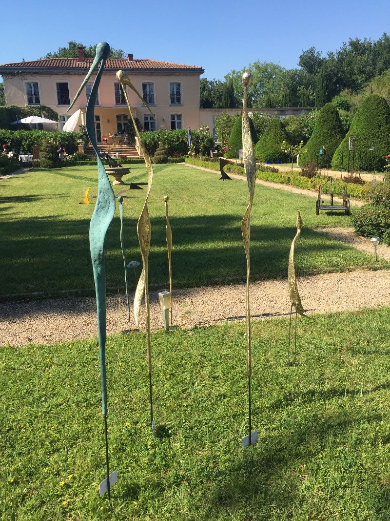 Les tiges sont en métal et se glissent dans les tube soudés aux socles. Les tiges peuvent donc être retirées des socles pour être plantées directement dans la terre si les sculptures sont destinées à vivre dans un jardin.