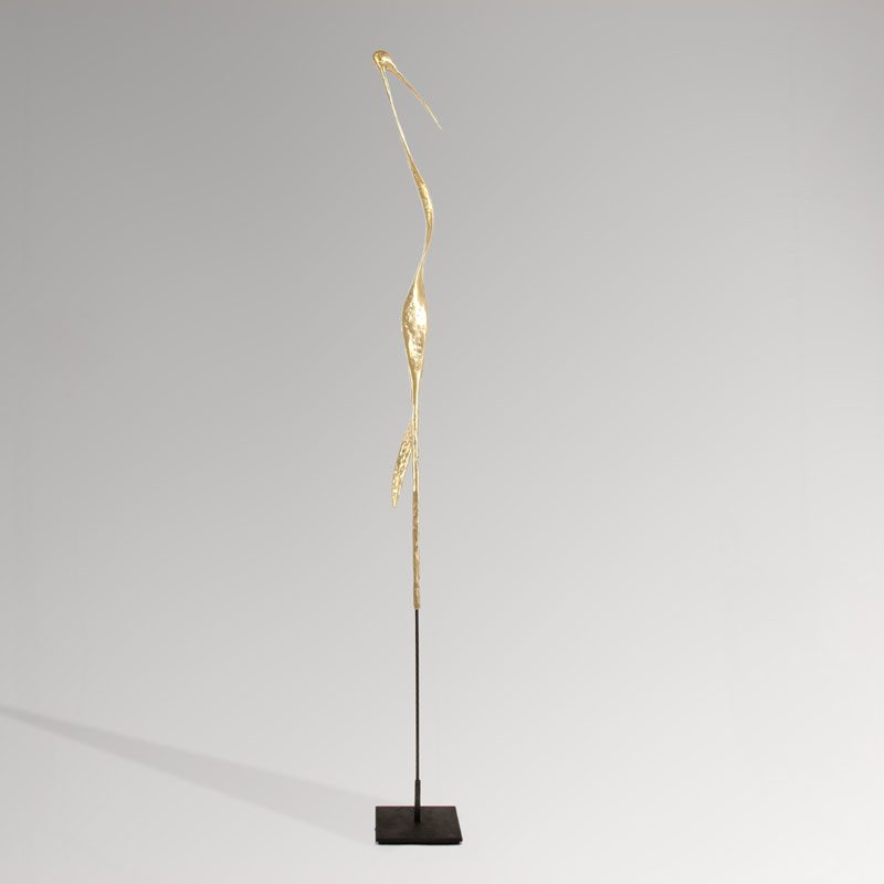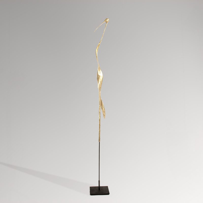 La tige en métal se glisse dans le tube soudé au socle d’une part et à l’intérieur de l’oiseau d’autre part. Celui-ci peut donc être retiré du socle pour planter la tige dans la terre si la sculpture est destinée à vivre dans un jardin.