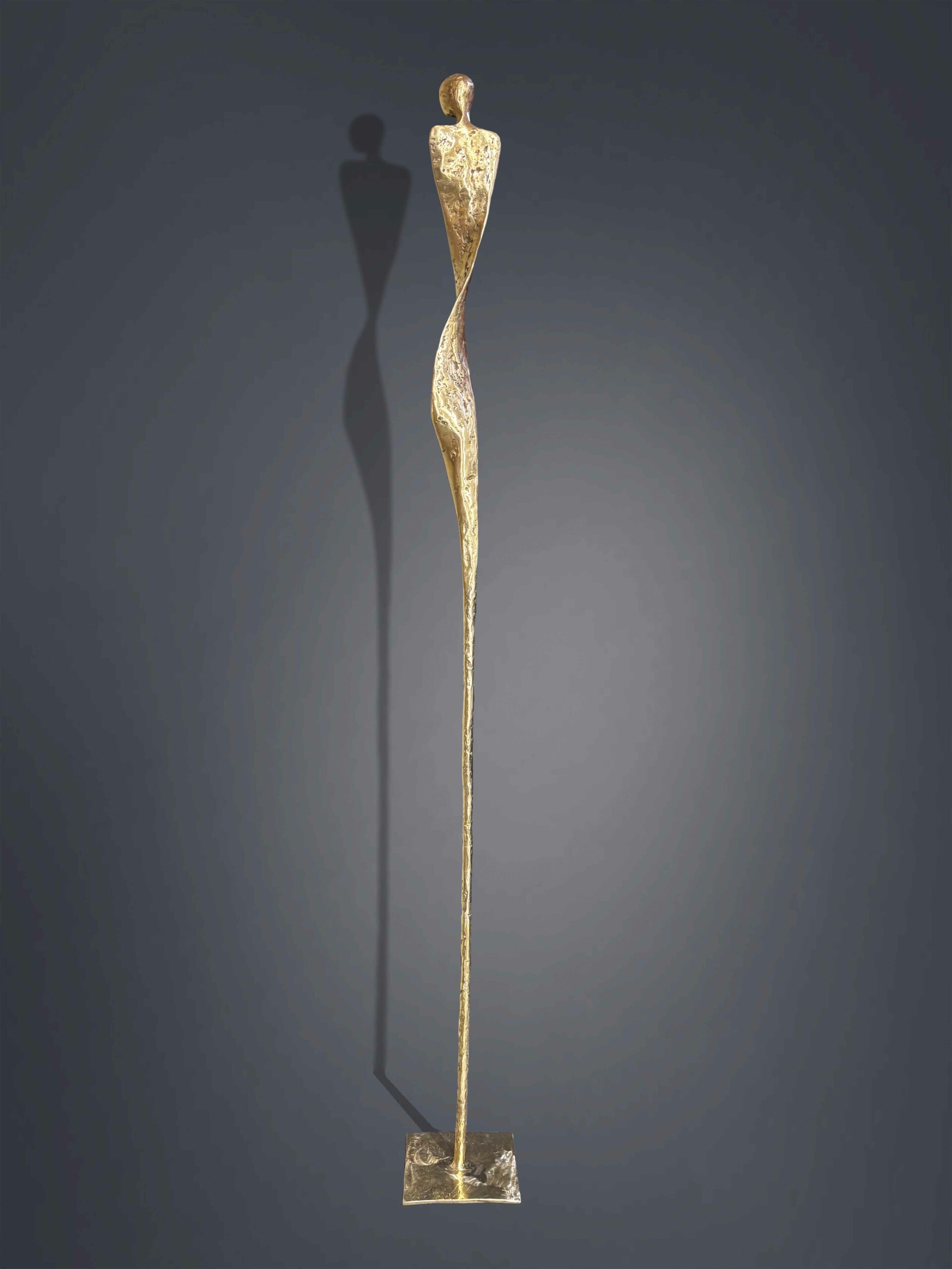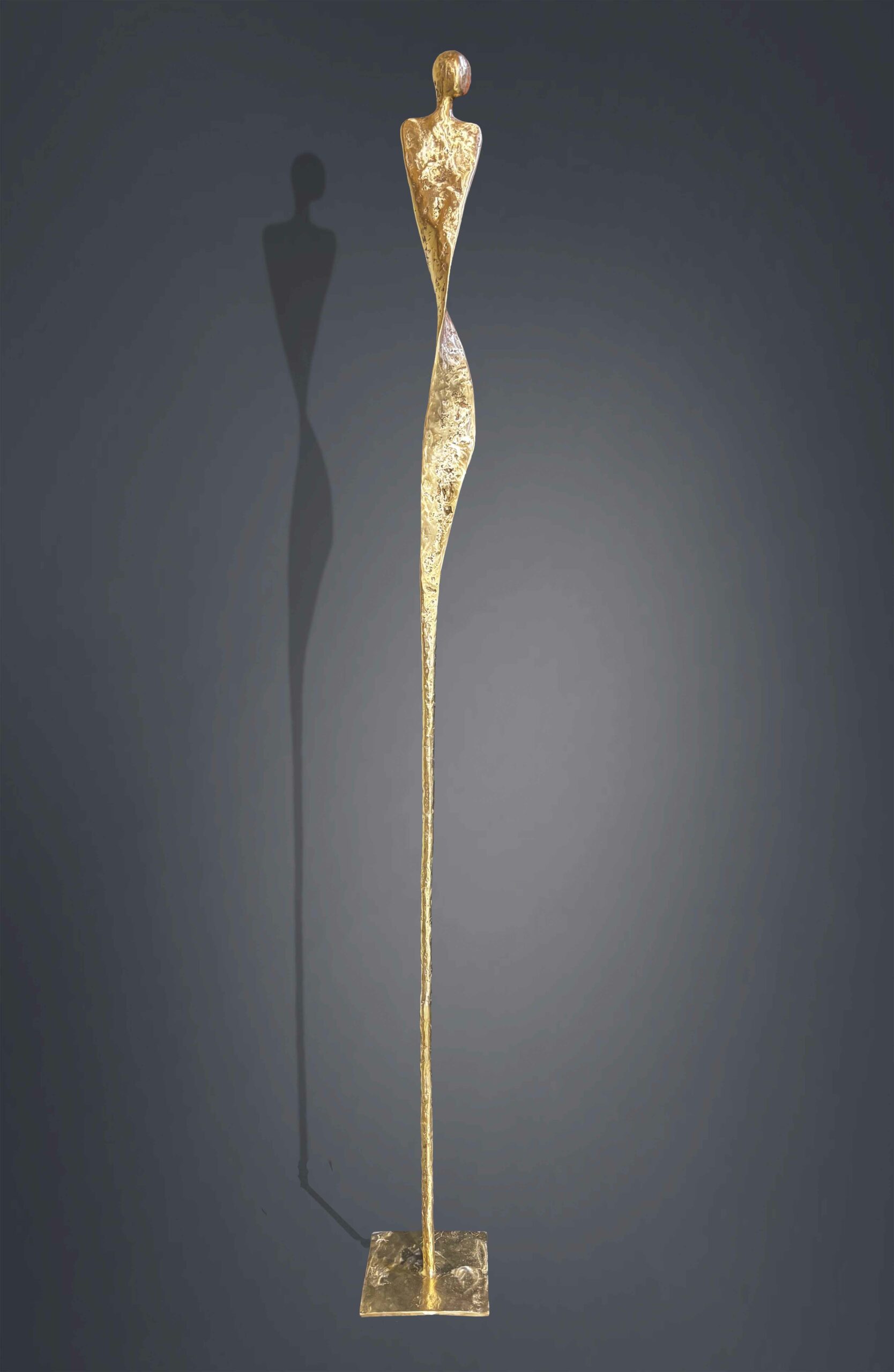 Cette sculpture de femme en bronze présente une silhouette humaine élancée, presque irréelle, qui semble défier les lois de l’équilibre. Sa forme minimaliste et épurée évoque une présence éthérée, entre abstraction et figuration. La finesse de la structure et son élévation donnent une impression de fragilité, contrastée par la solidité du bronze, un matériau souvent associé à la pérennité et à la robustesse.